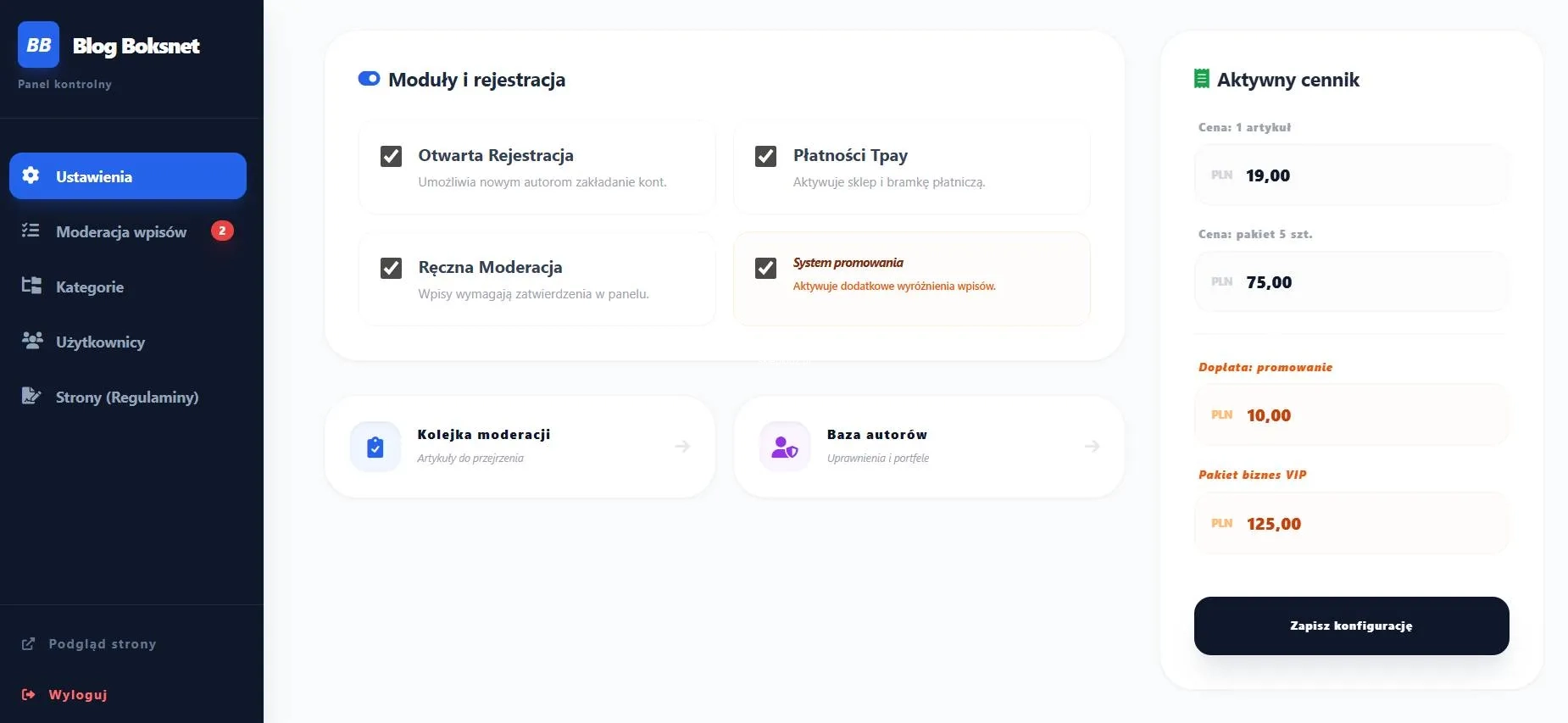 Konfiguracja systemowa: Możliwość włączania/wyłączania płatności, moderacji oraz rejestracji za pomocą jednego kliknięcia.