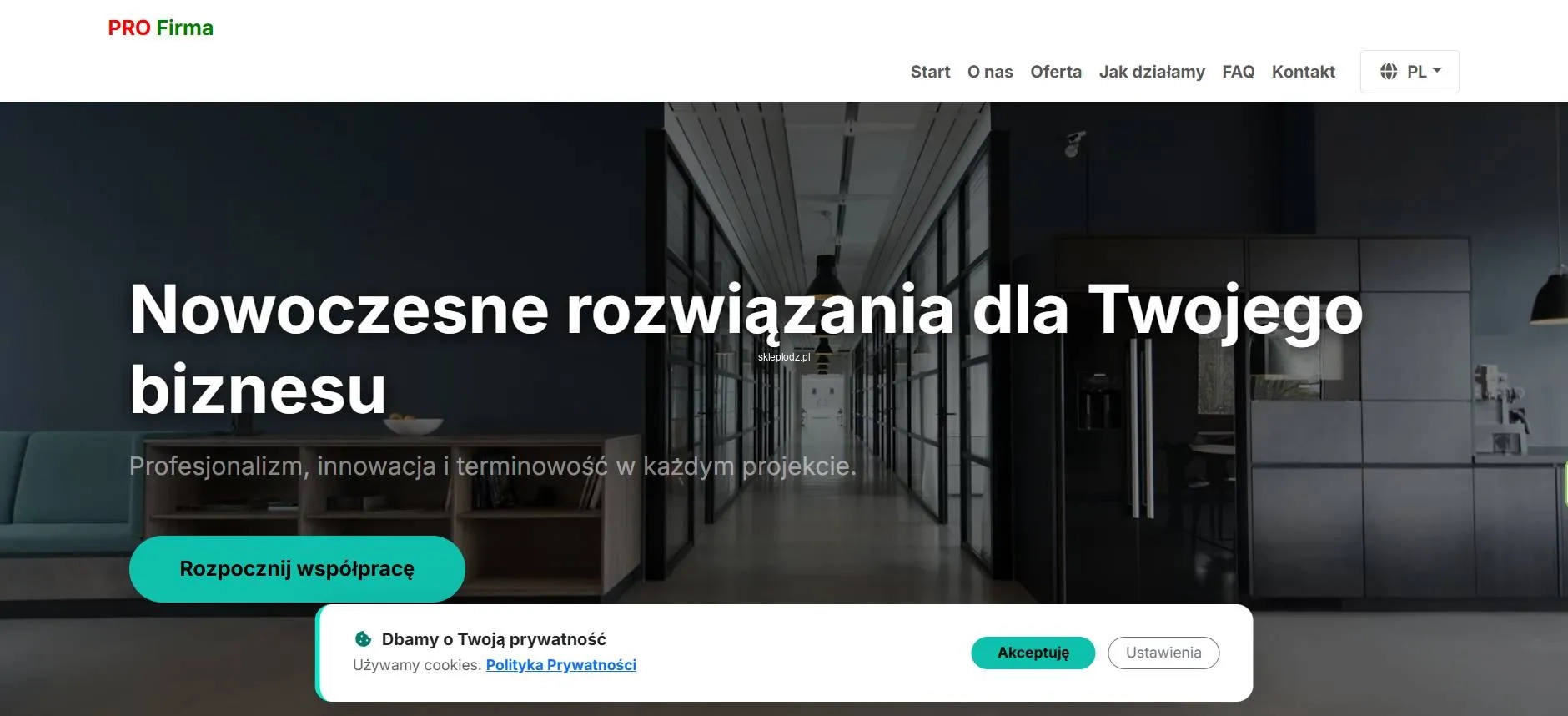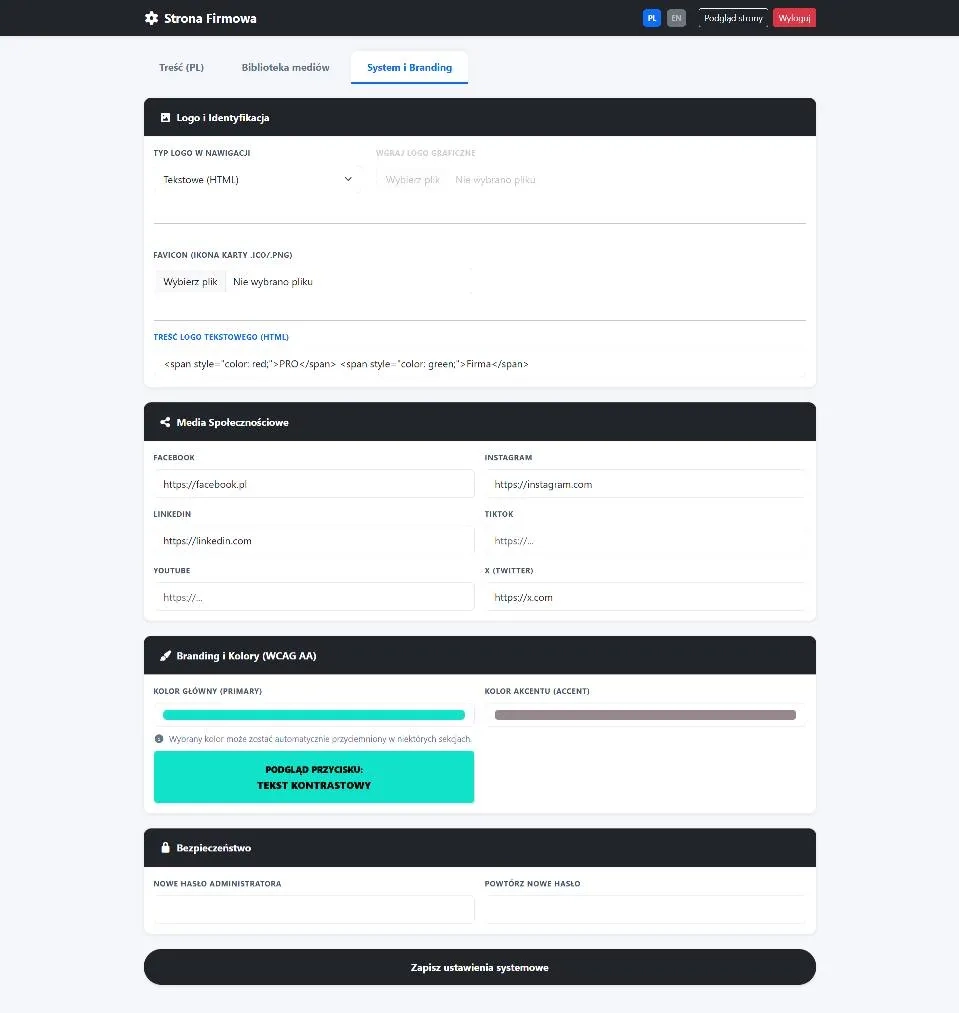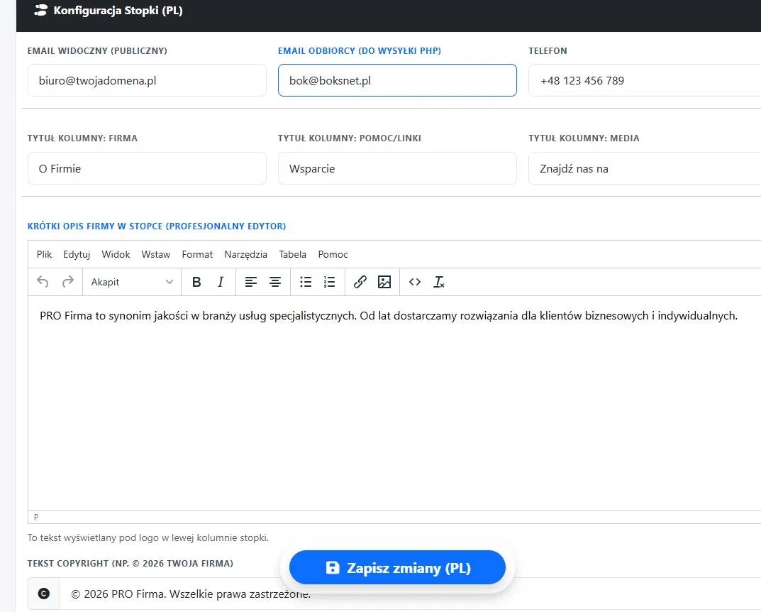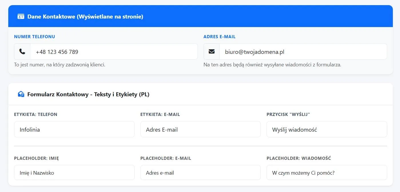 Sekcje biznesowe: Edycja liczników statystyk, treści "O nas", kafelków oferty oraz kroków procesu.